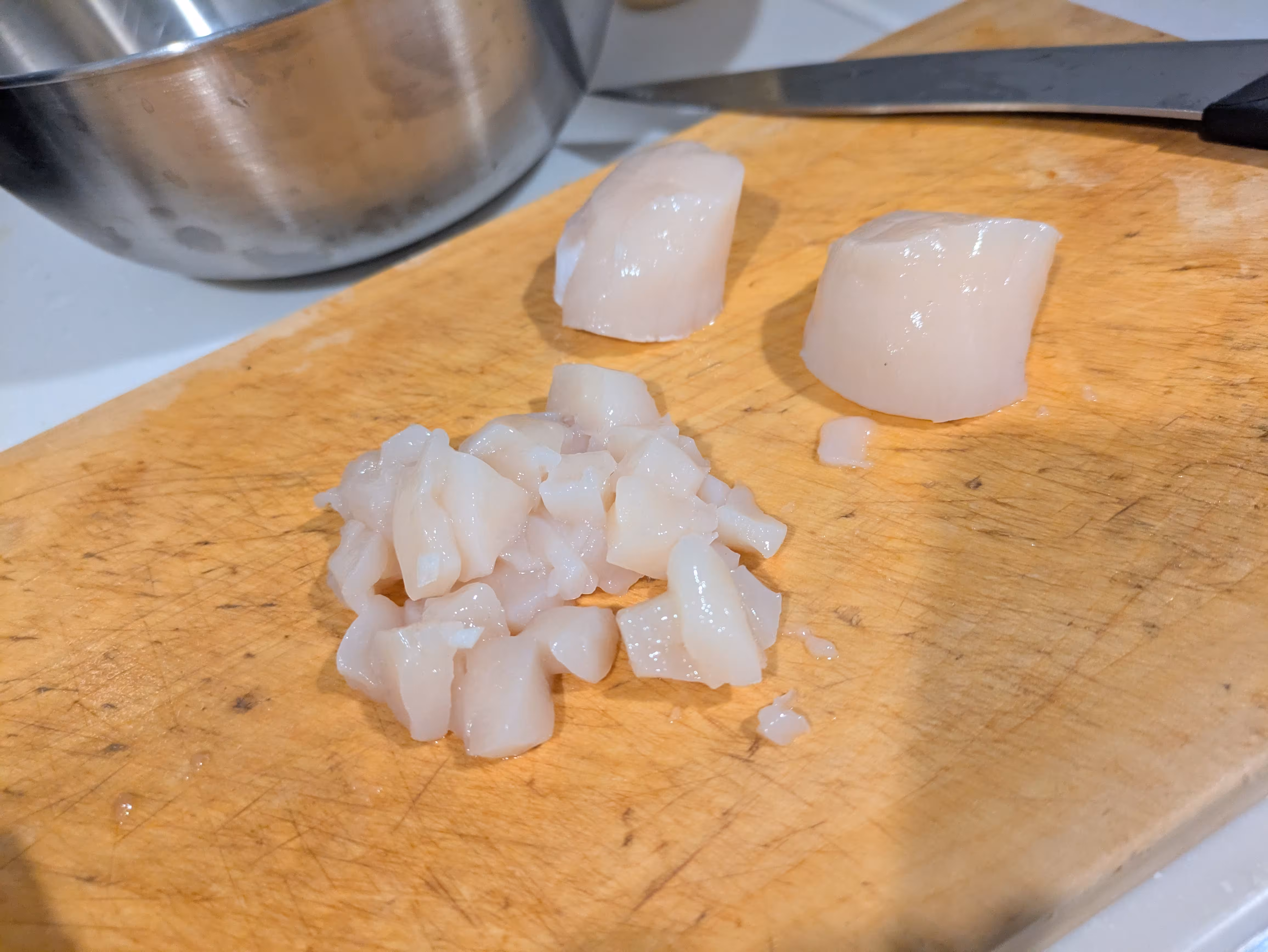 ゆで卵を作る間に、ホタテを1cm角くらいに切る(↓こんな感じ)
