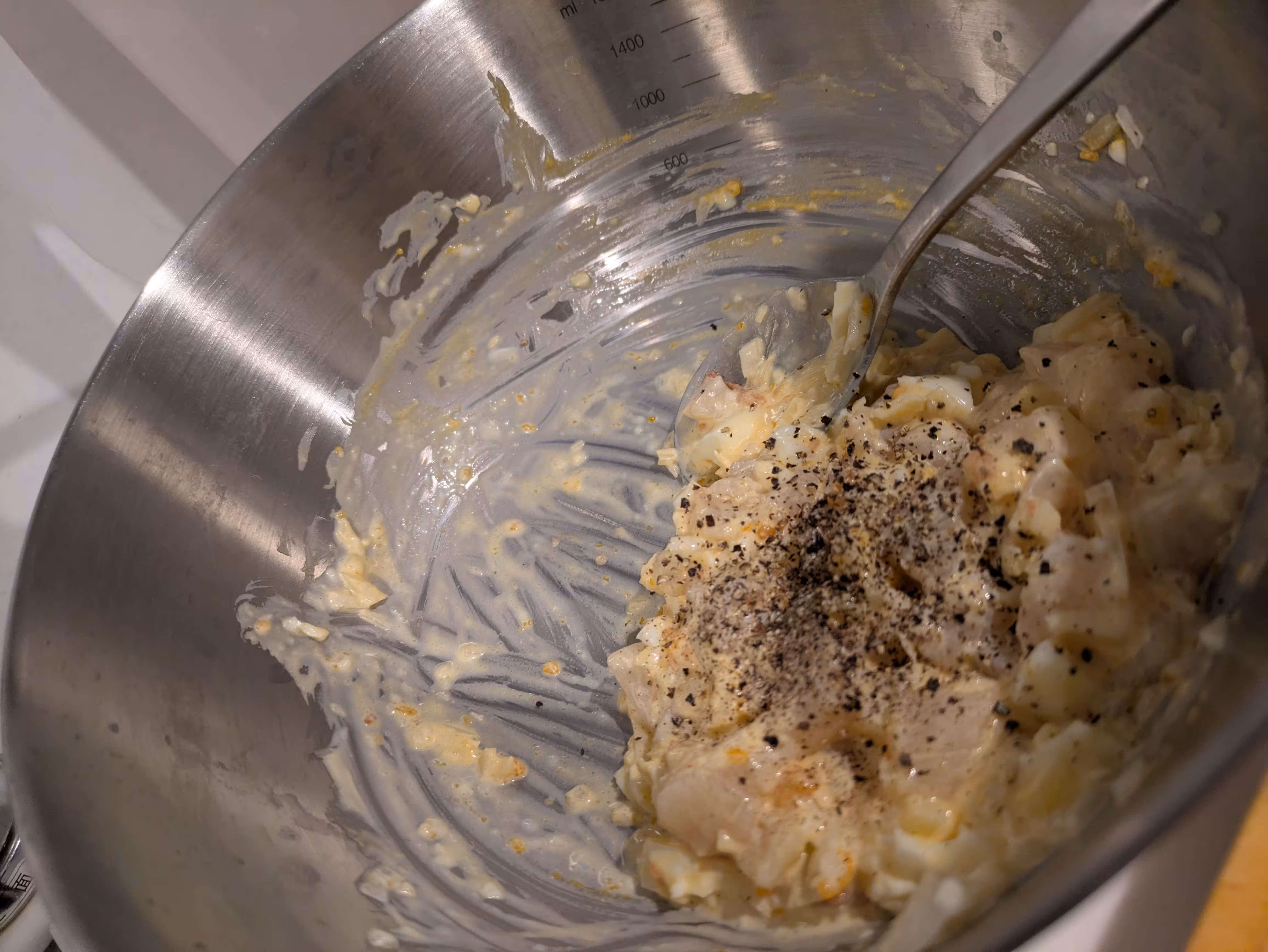茹で上がった卵の殻をむいて、刻んでおく 細かさはお好みで